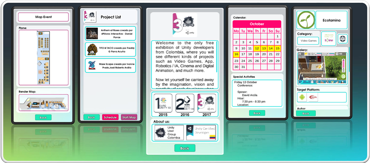 It is an event management platform (Web and mobile) that includes: user registration, administration of projects and atendees of the event, calendar, interactive maps, publication in social networks. project evaluation, appointment scheduling, event history. It is currently being used by Unity User Group Colombia for its annual Expo Unity event (which is sponsored by Unity Technologies)